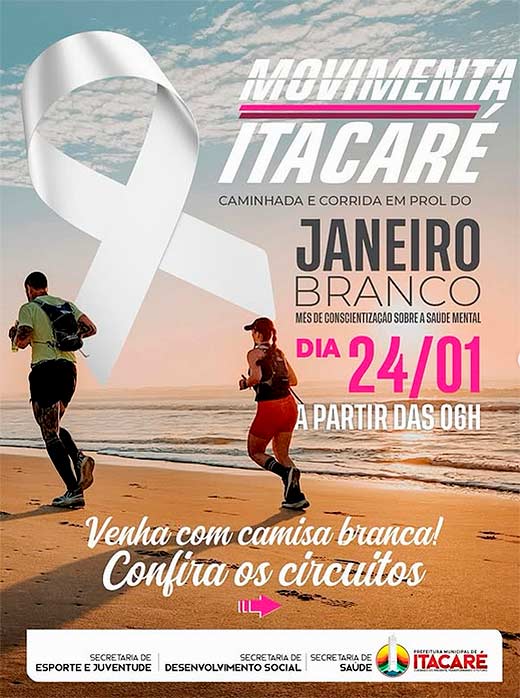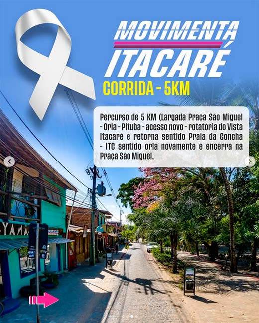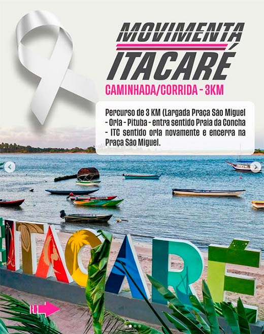 Em comemoração aos 294 anos de Itacaré, toda comunidade está convidada a participar da caminhada e corrida Movimenta Itacaré, com percursos de 3km, 5km e 10km. Um evento aberto a todos os públicos. Vá de branco! Concentração na Praça São Miguel com saída dos percursos a partir das 06h.
