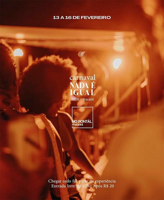 Nada é igual. É Carnaval. Liberdade. Sem igual. Dias descalços. Noites estreladas. Areia sob os pés. Céu em chamas. Música eletrônica conduz a folia. Agenda 13–16 de fevereiro: Bar de Praia 14h – 18h. Sunset · Palco da Praia 16h – 18h. Night Session · Palco da Mata 21h – 3h. Chegar cedo faz parte da experiência. Entrada livre até as 22h | após R$ 20,00.