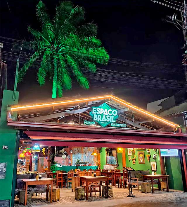 O Espaço Brasil oferece uma cozinha de alto nível em sua qualidade com preços acessíveis e atraentes, pizzas feitas em forno a lenha, tamanhos variados sobre massa fina e crocante. Grelhados, saladas e massas que surpreendem. Sempre cervejas bem geladas, bar completo, além da decoração especial e descolada, com som ambiente eclético, instalações confortáveis e o novo espaço Kids.