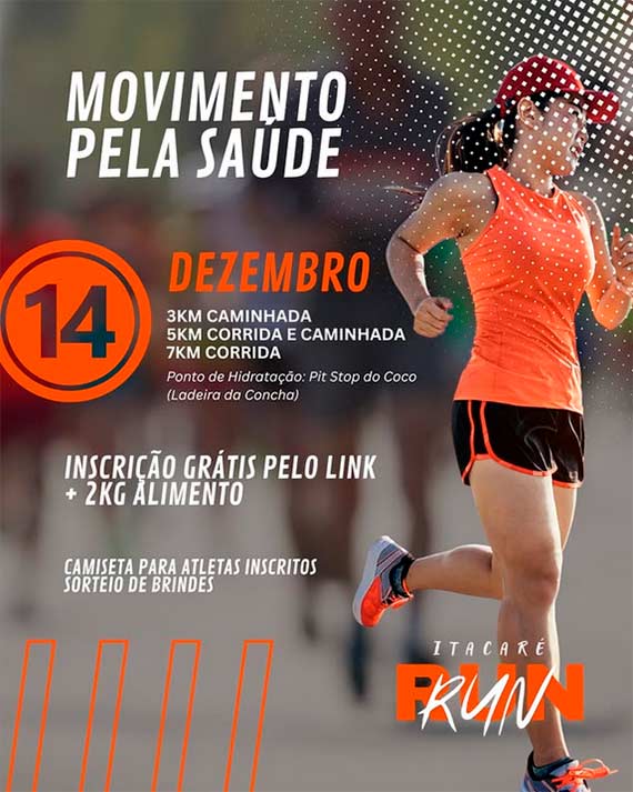 Evento gratuito de corrida e caminhada em Itacaré! O encontro está marcado no dia 14 de dezembro: Itacaré Run - Movimento pela Saúde! Percursos de 3km (caminhada), 5km (corrida e caminhada) e 7km (corrida), com saída às 7h da Praça São Miguel, em Itacaré! Corrida beneficente, com doação de 2kg de alimento não perecíveis e fraldas descartáveis, que serão encaminhadas à população vulnerável...
