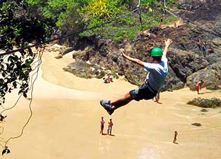 Megatiroleza com 200m para até 2 pessoas. Circuito de Arvorismo com 21 atividades, totalizando 227m de trilhas suspensas na Mata Atlântica.Praia da Ribeira