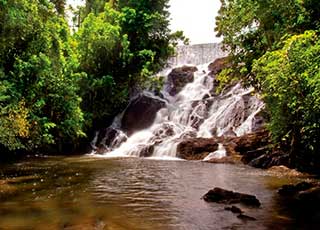 Acesso por barco ou canoa. A cachoeira se encontra dentro de uma fazenda que possui roça de cacau, cravo e criação de guaiamum. São 3 quedas com uma piscina natural boa para banho. Na fazenda existe um restaurante que serve tira-gostos e bebidas. É cobrado taxa de acesso por pessoa.Rio das Contas