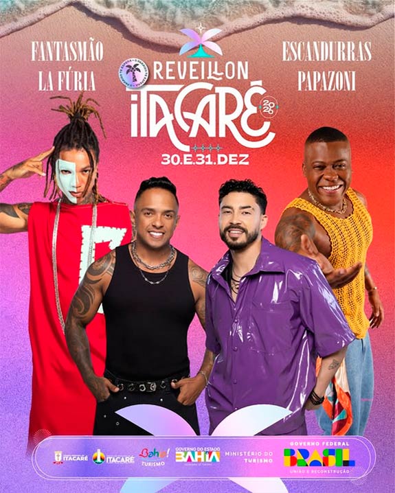 O Réveillon de Itacaré na Praia da Coroinha já é tradição, e este ano a identidade reflete o que por aqui há de melhor: alegria, acolhimento e a vibe única da nossa Orla. Nos dias 30 e 31 de dezembro, seu encontro é aqui, celebrando a vida e as novas oportunidades que chegam com o novo ano. O paraíso te espera de braços abertos! Fantasmão, Escandurras, La Fúria, Papazoni, Mussutaíba e Bruta Raça.